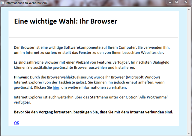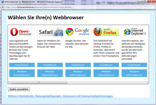 Nach genauerem Hinsehen war jedoch klar, dass es sich hier um die von der EU Kommission verordnete Auswahl des Internet Browsers handeln musste. Und stimmt ja, irgendwo in meinen 250 E-Mails des gestrigen Tages habe ich ja auch ein Aviso zum ersten internen Test dazu bekommen. Und schon war´s über das automatische Windows Update da…