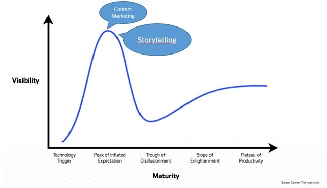 Trotzdem sind die Themen Content Marketing und Storytelling im derzeitigen Marketing Hypecycle bereits am ersten Extremwert der vom Marktforscher Gartner verwendeten Kurve angelangt.