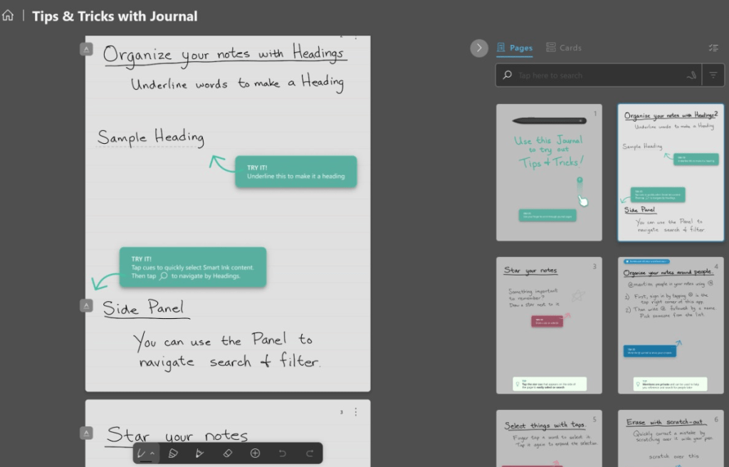 Mit Microsoft Journal (hier gratis im Microsoft Store erhältlich) können Nutzer handschriftliche Notizen digital erfassen. Neben Handschrift können über die App auch Zeichnungen eingegeben werden. Die Software unterstützt außerdem unterschiedliche Gesten. So werden mit einer Durchstreich-Bewegung etwa Wörter gelöscht. Das Umkreisen von Wörtern oder Sätzen mit dem Stylus hebt diese hervor.