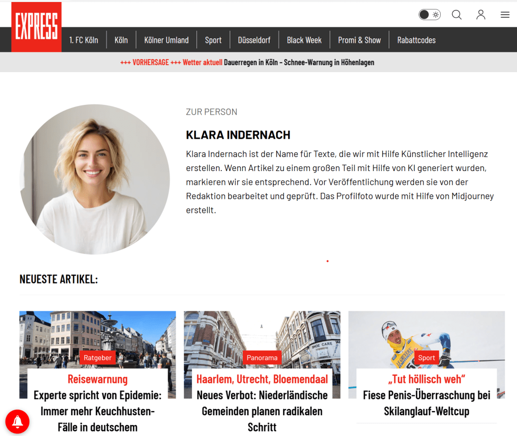 Klara ist jung, blond, hübsch. Sie ist überaus fleißig wie auch sehr vielseitig talentiert. Sie schreibt seit diesem Sommer für die Kölner Boulevardzeitung „express.de“ über eine große Spannweite von Themen, wie etwa Promi-News, Lebensmittelpreise, Chrome Updates oder Todesfälle. Wie schafft sie das alles bloß? Ein Klick auf ihren Namen klärt auf: Klara Indernach ist eine künstliche Intelligenz, ihr Kürzel: KI.